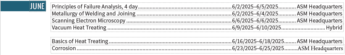 We have several classes running in June, check out the calendar (Course Offerings - ASM International)
