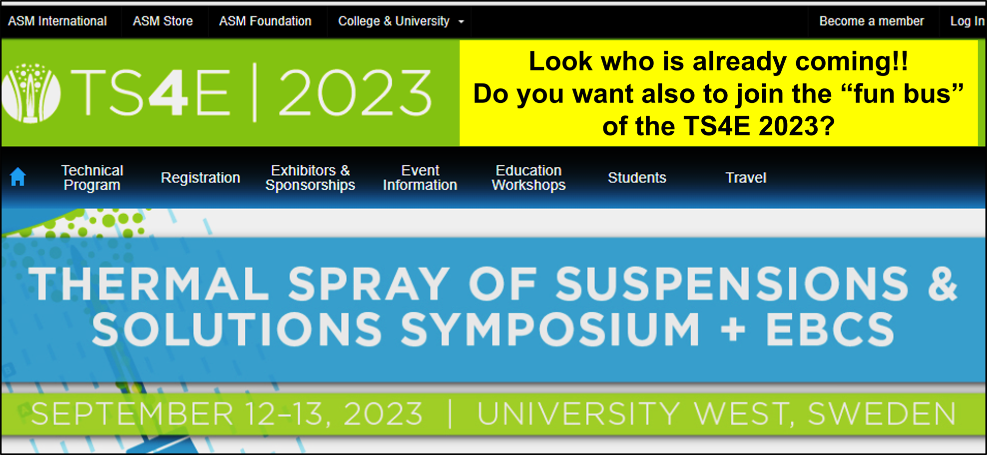 The ASM Thermal Spray Society (TSS) event Thermal Spray of Suspensions & Solutions Symposium + EBCs 2023 (TS4E 2023) is just a lit bit over a month away. The symposium will be held at the University West (Sweden) on September 12-13 (2023).