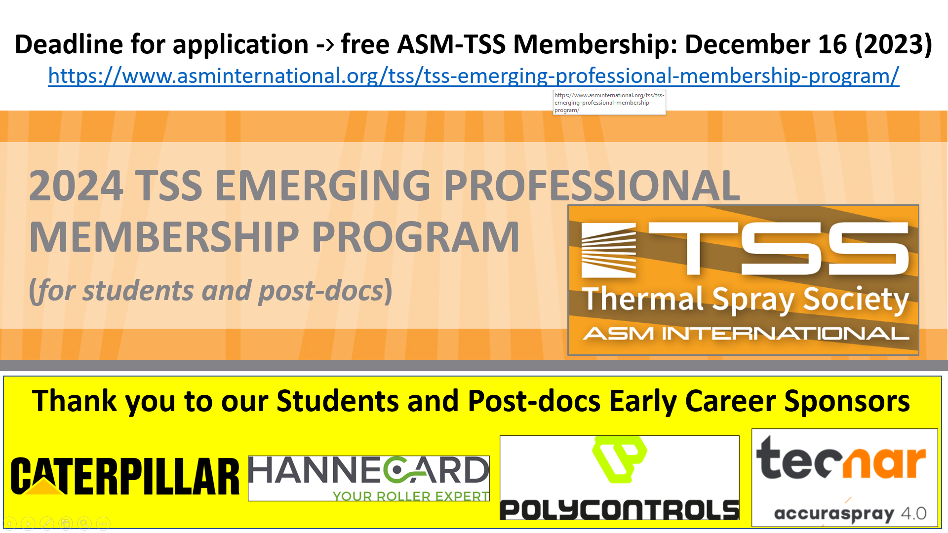 This is a friendly reminder to all thermal spray students and post-docs from all over the world. If you want to receive a free ASM Thermal Spray Society (TSS) membership in 2024, this is your chance. The deadline for application is coming fast; December 16 (2023).