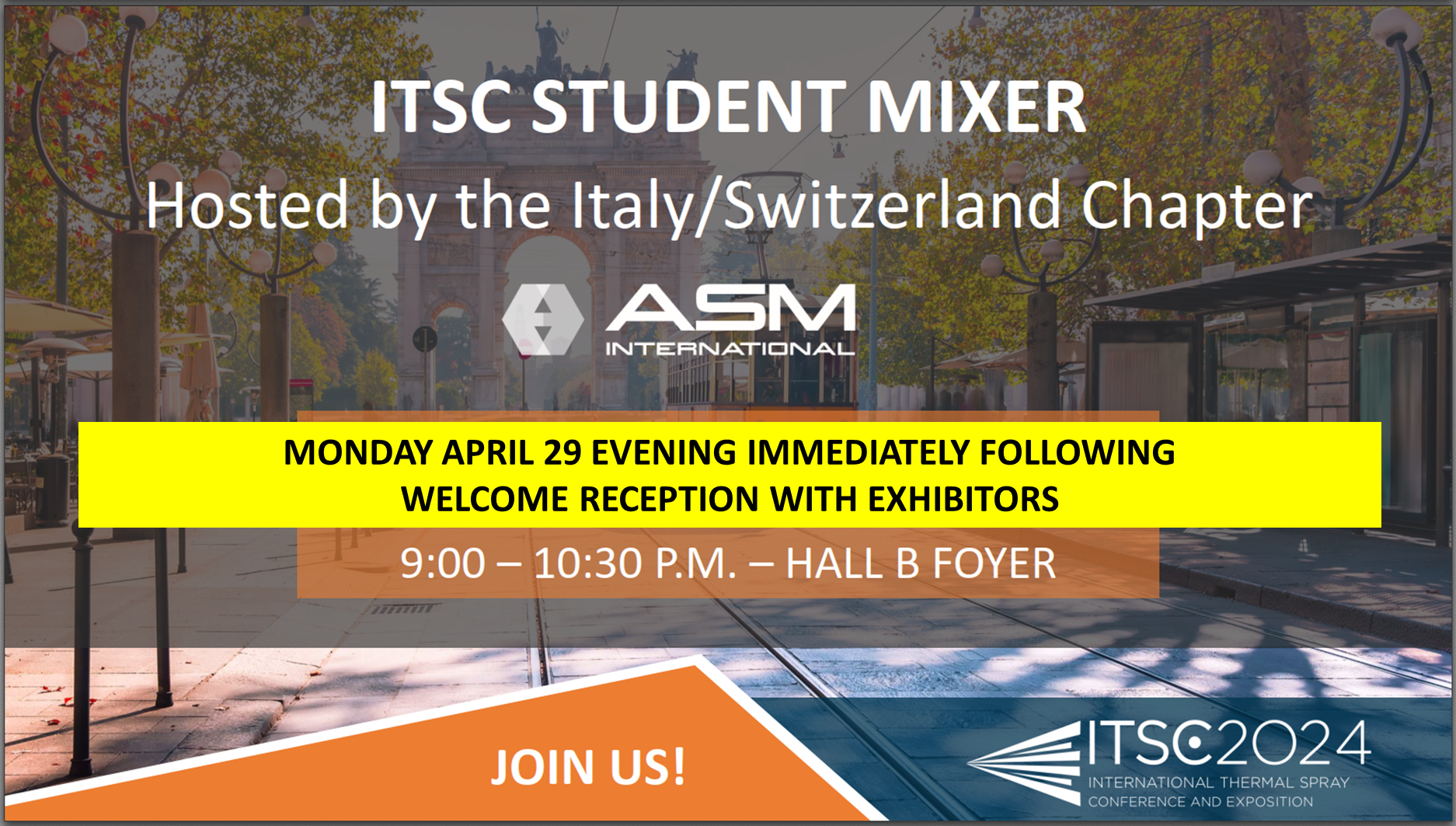 During the International Thermal Spray Conference 2024 (ITSC 2024) in Milan (Italy), ASM Thermal Spray Society (TSS) will organize a student mixer (just like the one we did for the ITSC 2023).