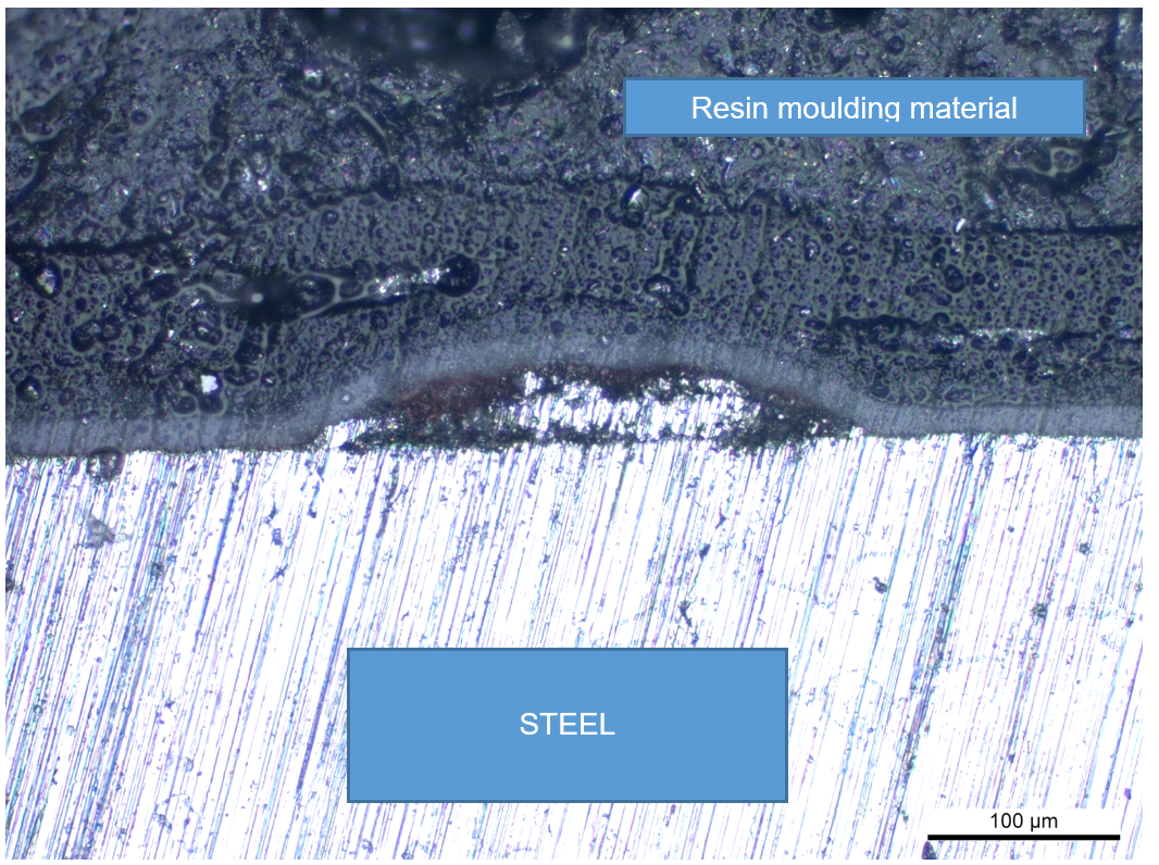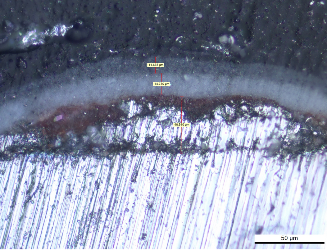 My concern is that the pretreatment layer next to the corroded area may not be adhering properly, possibly leading to an increase in corrosion products under the CED or pretreatment layer over time. This could cause the layer to lift from the base layer, as shown in the micrograph.