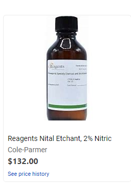 Good morning to all! We are looking for some insight into where we can purchase premixed Nital Etching solutions. Lately we have struggled with our current supplier and wish to pursue some other alternatives. The mixture currently is 70% Nitric Acid and 30 % water. The other we are considering is a premixed 2% Nital Solution for heat treat micro structure diagnosis for the lab. Our goal is to minimize the onsite mixing and have it available to our heat treat technicians on the floor. I look forward to others resources in this.