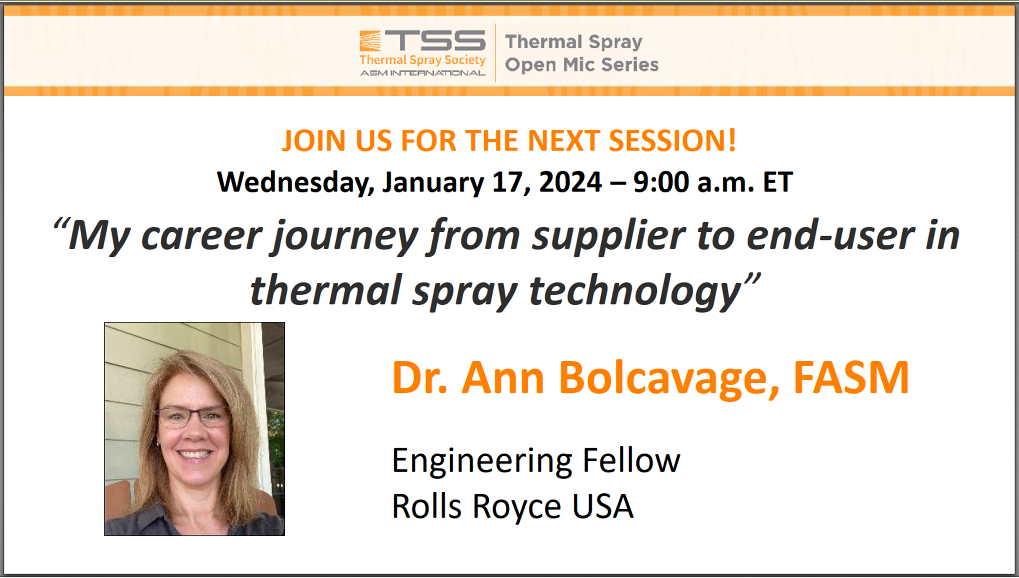 This is a friendly reminder about the next talk of the TSS Open Mic series promoted by ASM Thermal Spray Society (TSS).