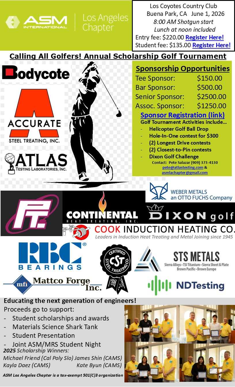 Every year the ASM LA chapter has hosted golf tournaments to raise proceeds that go towards providing scholarships to local undergraduates pursuing materials science related degrees. This is an opportunity for golf-lovers to enjoy themselves and help the community at the same time!
